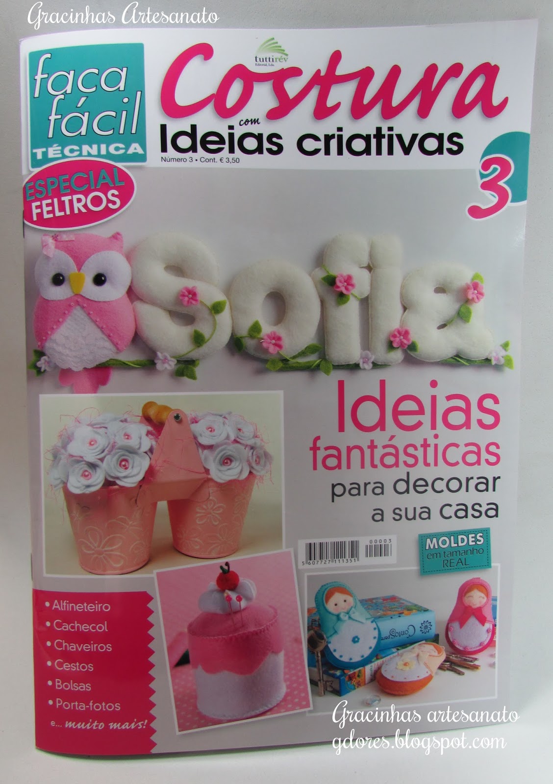 A Graça Dores, do blog Gracinhas Artesanato, do qual sou seguidora, apresentou vários trabalhos seus na revista "Costura com ideias Criativas" nº3.